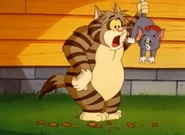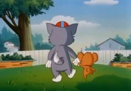 Soon, Clyde drags a groggy Tom to a door which is a closet, which a lot of stuff falls on Tom's head. When Clyde opens a cabinet, which contains an ironing board, flattens Tom, and an iron falls on Tom's head. However, Tom sees Jerry running, and goes after him, with Clyde following. Outside, Jerry gets to another mouse hole safely, and when Tom tries to dig his way in the mouse hole, Clyde lifts up the house and as Jerry exits, and Tom goes in, Clyde drops the house on Tom and tries to grab Jerry, but comes up empty, and lifts up the house to see a flattened Tom, as he crawls out of the house's underside.