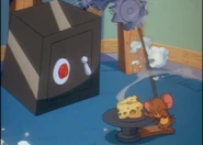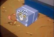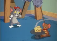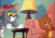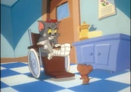 Tom returns to life and is sitting on a chair in football pads trying to avoid getting hurt and losing his last life. Jerry attempts to taunt Tom, but the cat is cautious and refuses to chase Jerry. The mouse However, doesn't stop which is too much for Tom to ignore and starts to chase Jerry, ever so carefully. Tom tries to be extra cautious with what he does but ends up causing more harm for himself as Jerry is taking full advantage of this maliciously, but Tom orders a survival shelter to keep himself safe. Unfortunately, the shelter doesn't include batteries so Tom gets stuck inside, until Jerry hits the emergency button that blows up the shelter. Tom then puts on full scale armor to chase after Jerry, but the chase results in Tom getting picked up by an auto wrecker electromagnet and placed in a metal crusher, crushing Him like a cube.