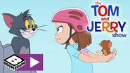 Tom spots Jerry playing with the girl on her trampoline and uses a hammock to catch him but Emily whacks him with her tennis racket as a warning. Tom scratches on the door but Ginger says she's still cleaning up 'his' mess. Tom spots Jerry inside a bubble then uses a gadget to get Jerry back then Emily realizes that Jerry is going into the hole on the fence that she rescues him leaving Tom alone. Back inside of the house, Ginger gives Tom a gingerbread mouse before Tom eats it he uses as to pretend to think that's Jerry then he destroys the cookie and realizes that he wants Jerry back.
