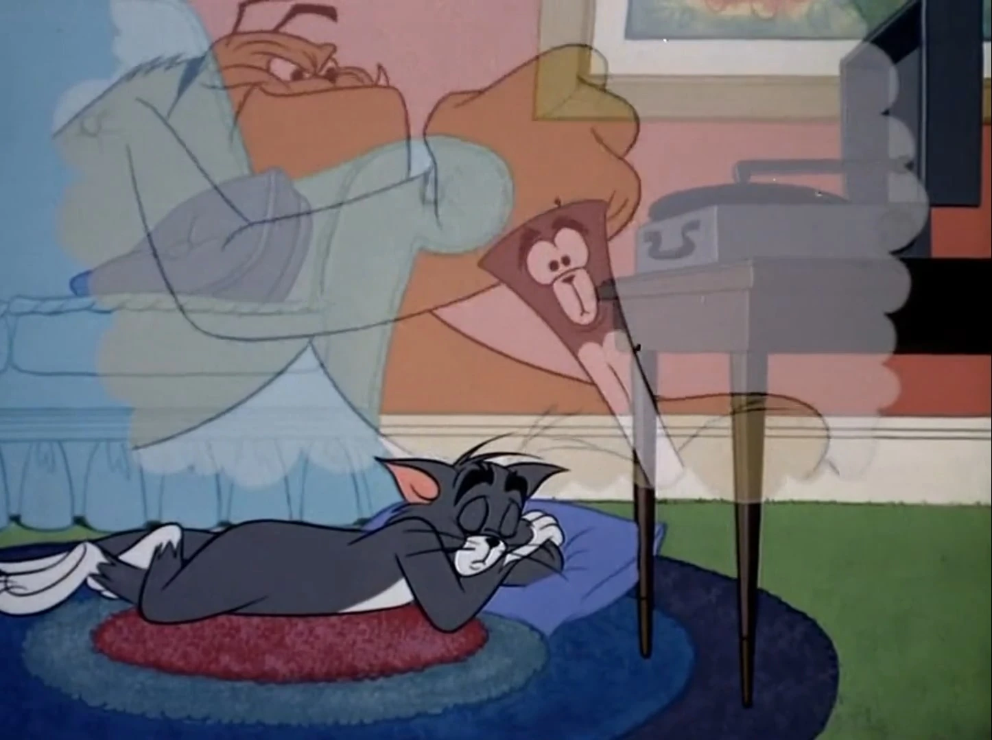 Tom finally throws in the towel, plays some smooth jazz on a record and then takes some sleeping pills which immediately sends him to a deep slumber, where he calmly dreams of being pounded once again into the ground, which to Tom, does not appear to be so scared anymore and has now become a rather pleasant thought. After all, it's better than dealing with that tiny mutt.