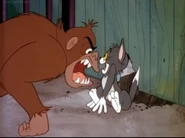 At the Circus. Tom chases Jerry to the circus. Jerry run through a hole in a fence. Tom look through the hole in a fence. Then Tom digs a hole and sneaks into the circus to look for Jerry. Suddenly the Gorilla appears and stares at Tom and growl at him. Tom flee from the hole and undig the hole and Tom use the wooden planks to cover the hole and hammers and runs away. Jerry put the left elbow on the gorilla foot. Then the Gorilla winks.
